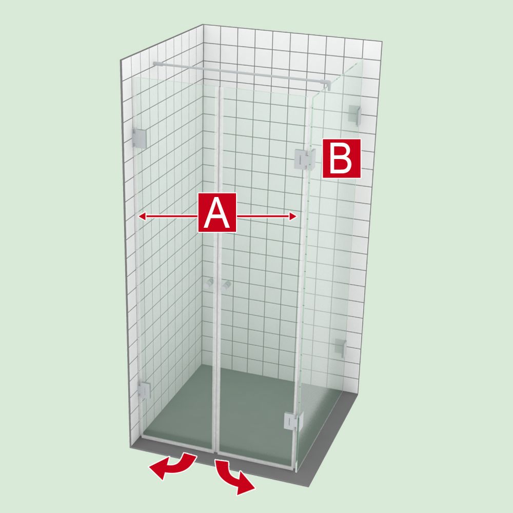 Eck-Dusche, Doppeltür DIN-links + DIN-rechts + festes Seitenteil --- Lieferumfang: 3x ESG-Sicherheitsglas 8mm, klar, als Doppeltür DIN-links + DIN-rechts + festes Seitenteil, 2x Duschpendel-Türband Wand/Glas 90°, 2x Duschpendel-Türband Glas/Glas 90°, 2x Winkelverbinder Wand/Glas 90°, 2x Duschtürknopf, 1x Stabilisations-Stange Wand/Glas 90°, 1250 mm (kürzbar), 2x Dichtprofil, Seitliche Streifendichtung, 1x Magnet-Dichtprofil 180°, 1x Wasserabweisprofil unten mit Streifendichtung.