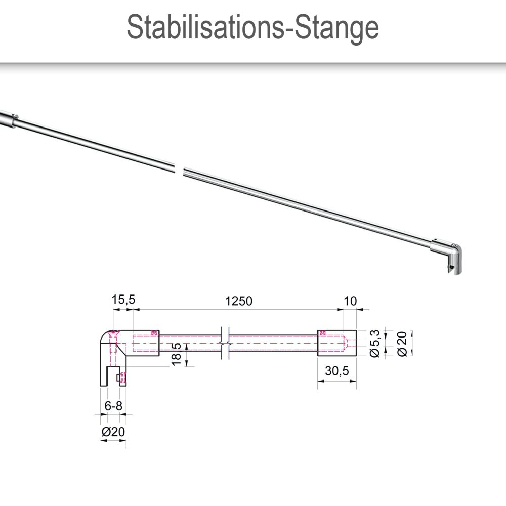 • 1x Stabilisations-Stange Wand/Glas 90°, Länge: 1250 mm (kürzbar), ⌀ 20 mm, glanzverchromt