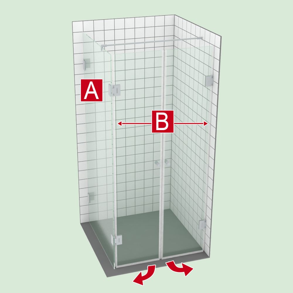 Eck-Dusche, Doppeltür DIN-links + DIN-rechts + festes Seitenteil --- Lieferumfang: 3x ESG-Sicherheitsglas 8mm, klar, als Doppeltür DIN-links + DIN-rechts + festes Seitenteil, 2x Duschpendel-Türband Wand/Glas 90°, 2x Duschpendel-Türband Glas/Glas 90°, 2x Winkelverbinder Wand/Glas 90°, 2x Duschtürknopf, 1x Stabilisations-Stange Wand/Glas 90°, 1250 mm (kürzbar), 2x Dichtprofil, Seitliche Streifendichtung, 1x Magnet-Dichtprofil 180°, 1x Wasserabweisprofil unten mit Streifendichtung.
