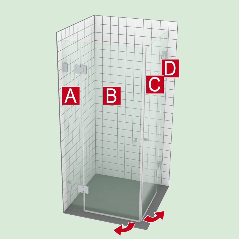 Eck-Dusche, 2 Türen + 2 feste Seitenteile --- Lieferumfang: 4x ESG-Sicherheitsglas 8mm, klar, als 2 Türen (DIN-links + DIN-rechts) + 2 feste Seitenteile, 4x Duschpendel-Türband Glas/Glas 180°, 4x Winkelverbinder Wand/Glas 90°, 2x Duschtürknopf, 2x Mittelprofil für fluchtende Türanordnung, 1x Magnet-Dichtprofil 90°, 1x Wasserabweisprofil unten mit Streifendichtung.