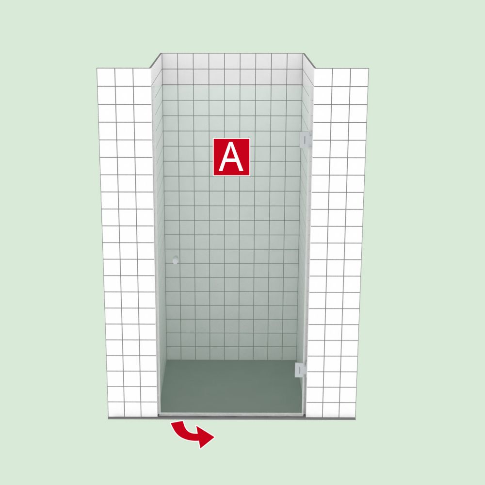 Für die Bestellung der Duschkabine sind Flächenangaben erforderlich. Diese Flächen sind in der Duschkabinen-Ansicht mit einem weiß-roten Großbuchstaben (A, ...) gekennzeichnet.