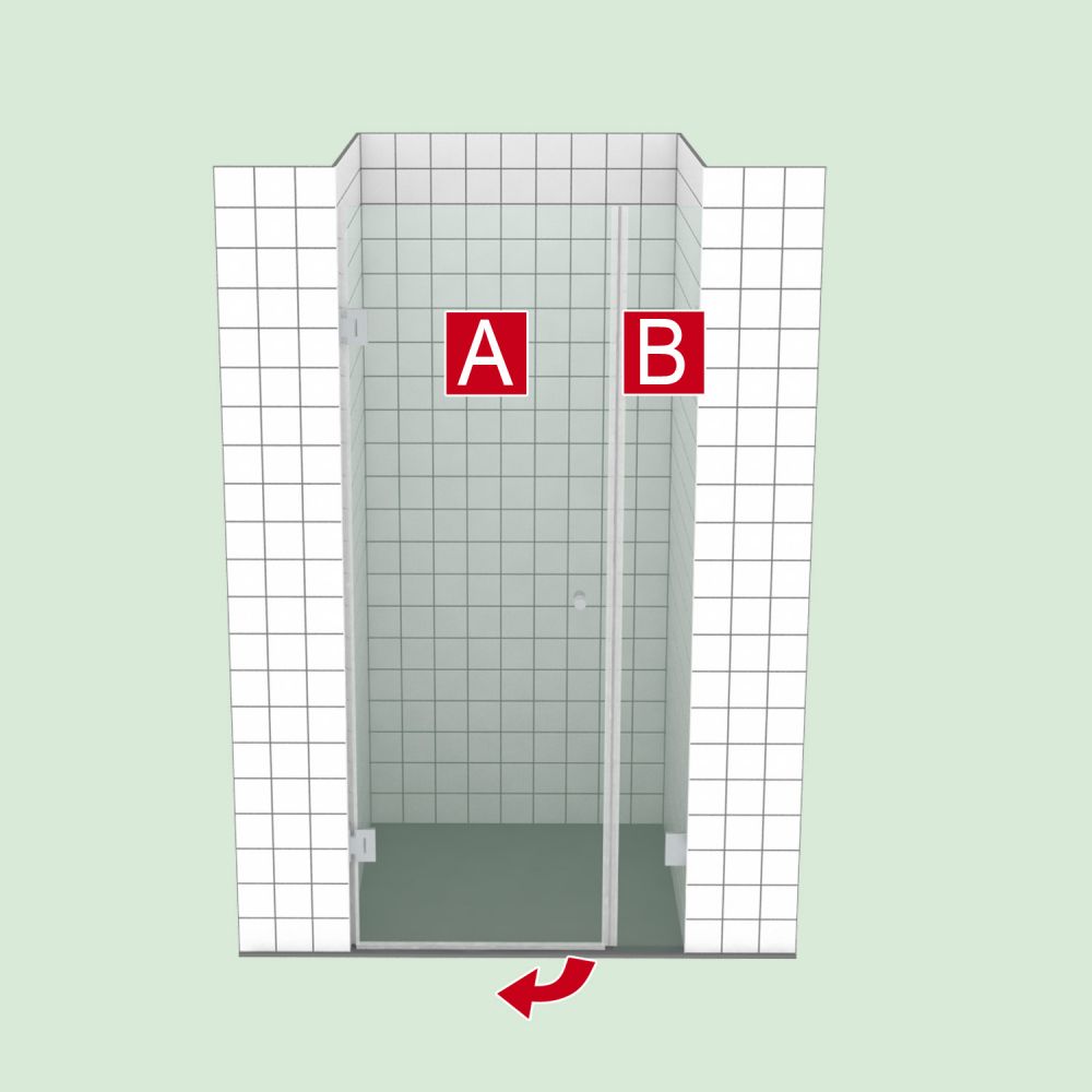 Für die Bestellung der Duschkabine sind Flächenangaben erforderlich. Diese Flächen sind in der Duschkabinen-Ansicht mit einem weiß-roten Großbuchstaben (A, ...) gekennzeichnet.