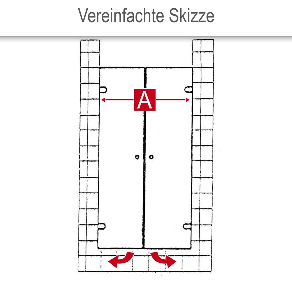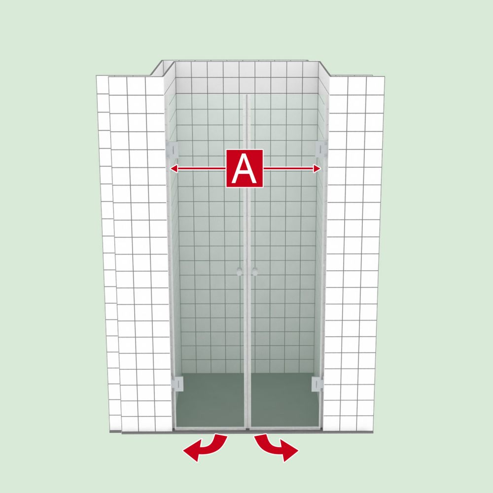 Nischen-Dusche, Doppeltür --- Lieferumfang: 2x ESG-Sicherheitsglas 8mm, klar, als Doppeltür DIN-links + DIN-rechts, 4x Duschpendel-Türband Wand/Glas 90°, 2x Duschtürknopf, 2x Dichtprofil, Seitliche Streifendichtung, 1x Magnet-Dichtprofil 180°, 1x Wasserabweisprofil unten mit Streifendichtung.